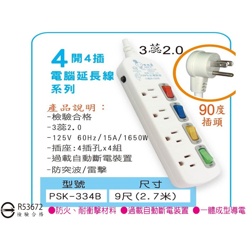 台灣製 電精靈 4開4插 電腦延長線 9尺 過載保護防雷擊/獨立式開關 四開四插延長線/電源線/15A/1650W/露營