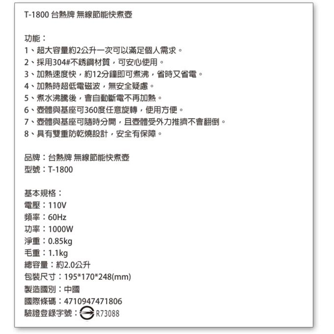 台熱牌304不鏽鋼快煮壺 2公升T-1800 (1入) 分離式無線壺身 節能電煮壺 燒開水 泡茶壺 省電省時快速壺