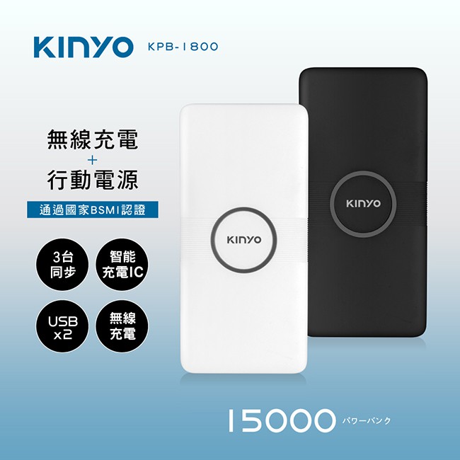 含稅全新原廠保固一年KINYO可無線充電24W大輸出安規認證9重保護行動電源(KPB-1800)