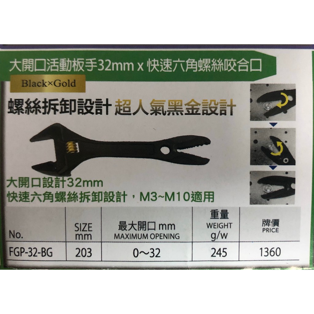 含稅 黑金系列-大開口活動板手32mm x 快速六角螺絲咬合口 FGP-32-BG FUJIYA 富士箭
