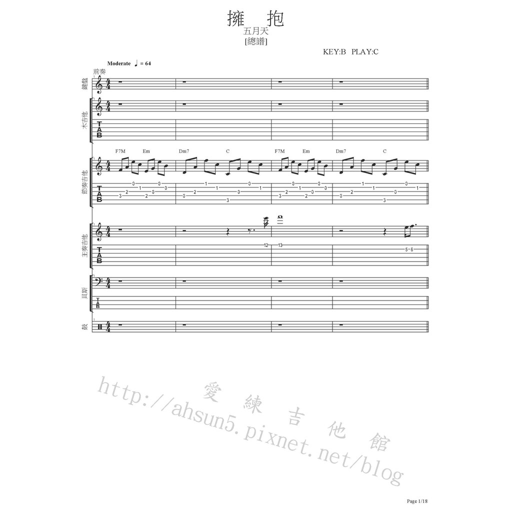 團譜 ~五月天_擁抱~[吉他譜][貝斯譜][鼓譜][鍵盤][五線譜][樂譜]