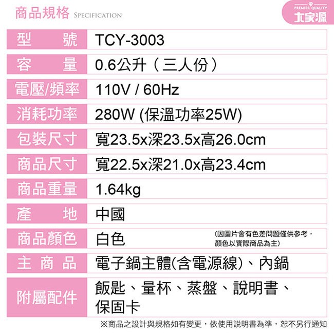大家源 TCY-3003 3人份 電子鍋 上班族 學生族 小家庭 飯鍋 小家庭 外宿 學生族 檢驗合格 三人份電子鍋