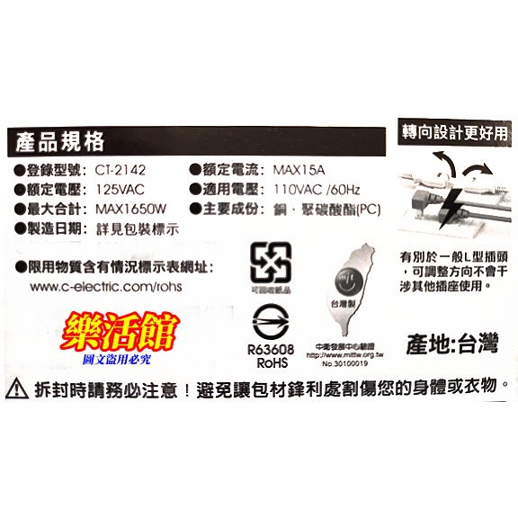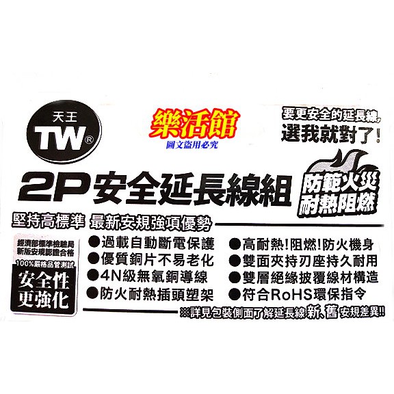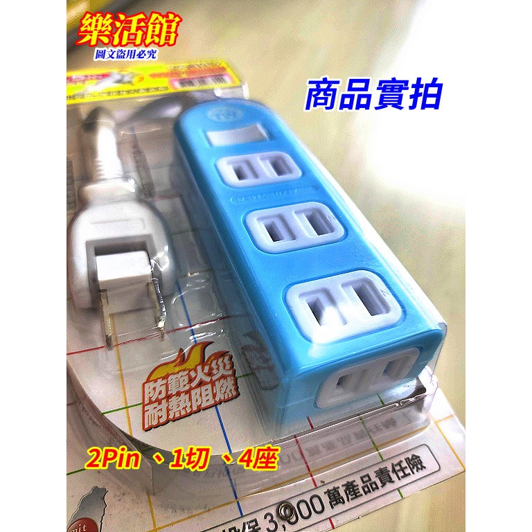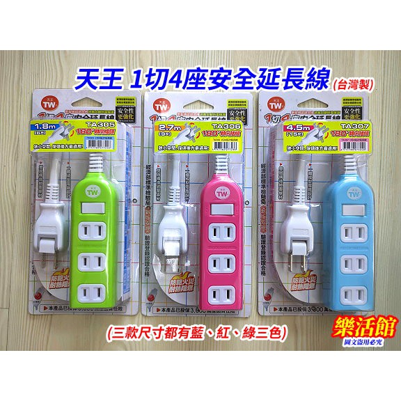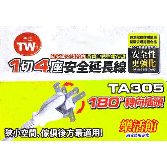 天王 1切4座安全延長線(2Pin 四插孔) 台灣製 電纜線 便利型電源插座 電腦延長線 安全插座 安全延長線圈