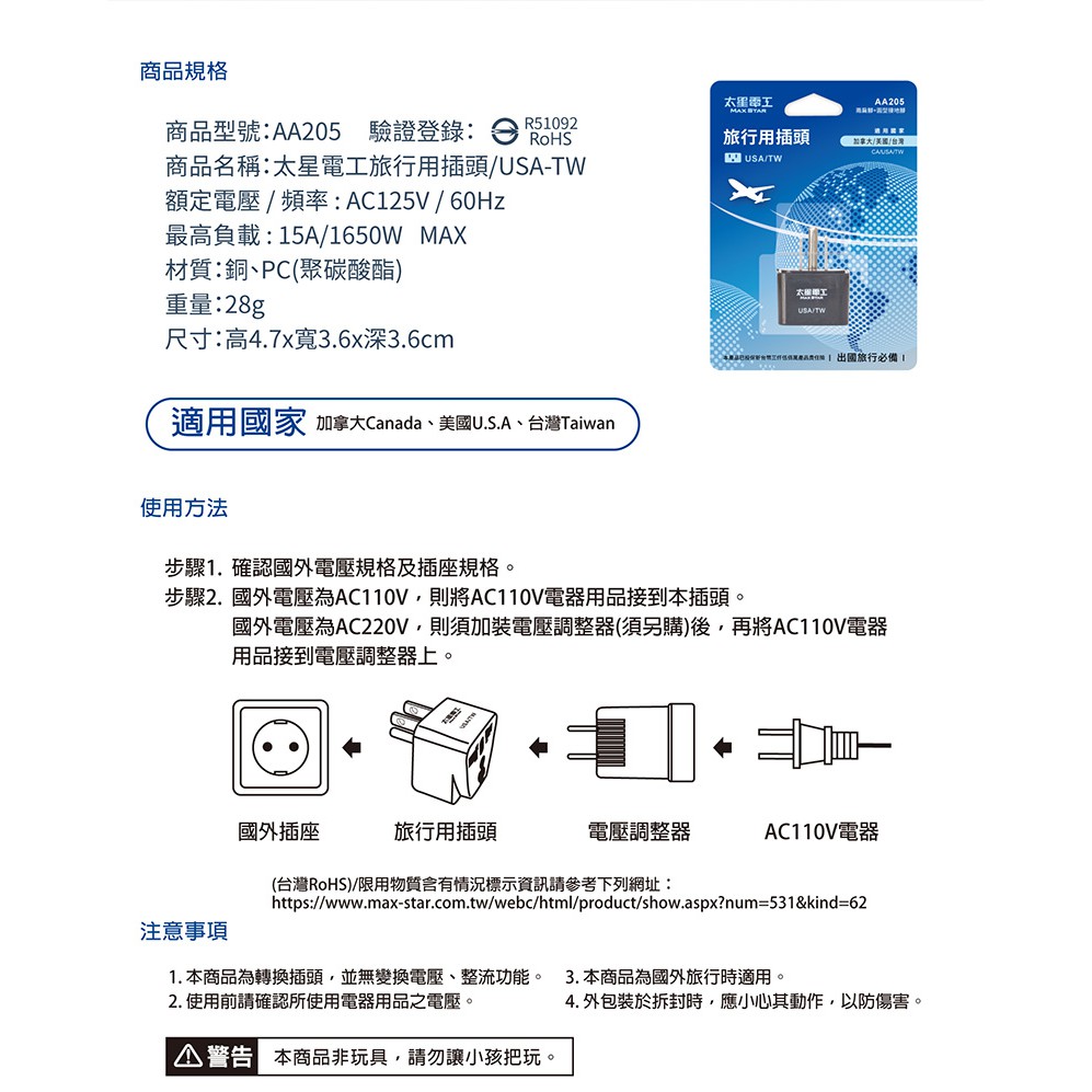 太星電工 旅行用插頭/USA-TW AA205 現貨 廠商直送