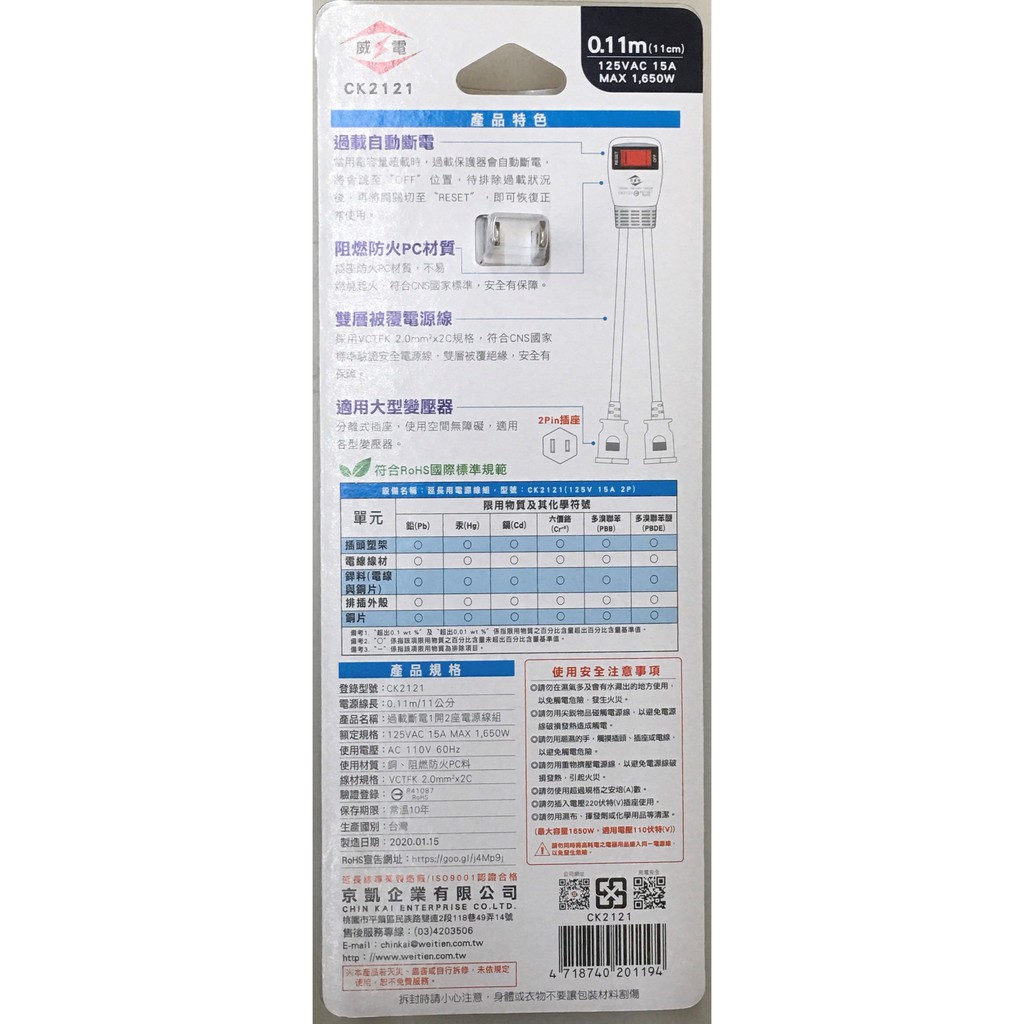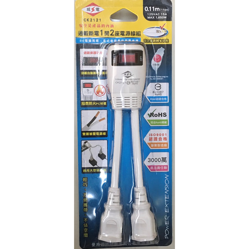 威電 新安規 過載斷電1開2座電源線組 CK2121 延長線