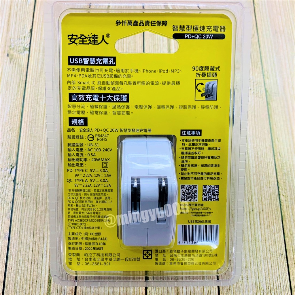 安全達人 20W智慧型極速充電器 UB-51 高效快充 PD/QC 20W 智慧分流 可同時充電