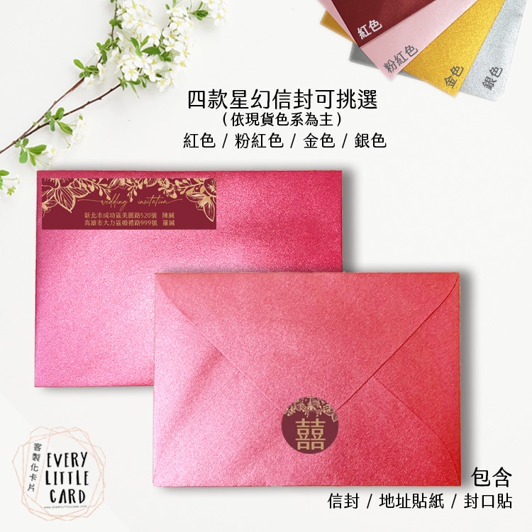 客製化 明信片式 喜帖 006 / 西式 / 紅色 金色 粉紅色 銀色 星幻信封 / 封口貼 地址貼紙