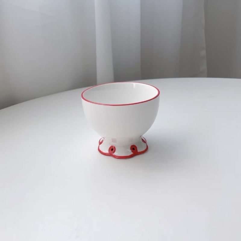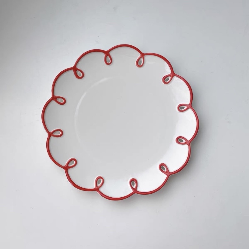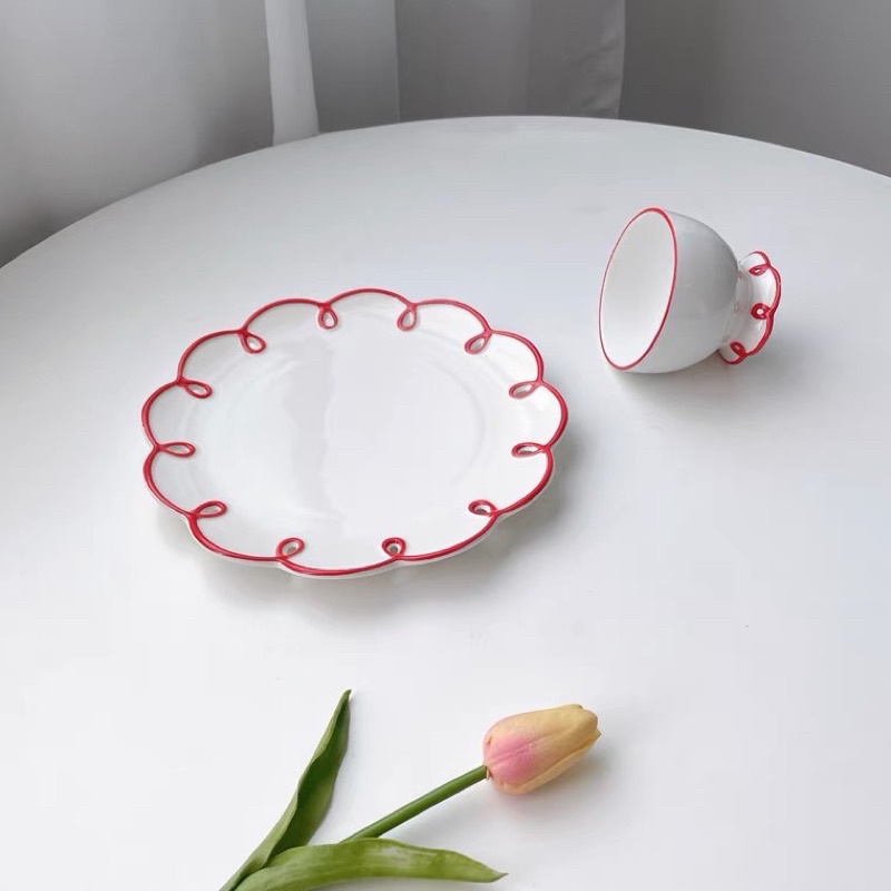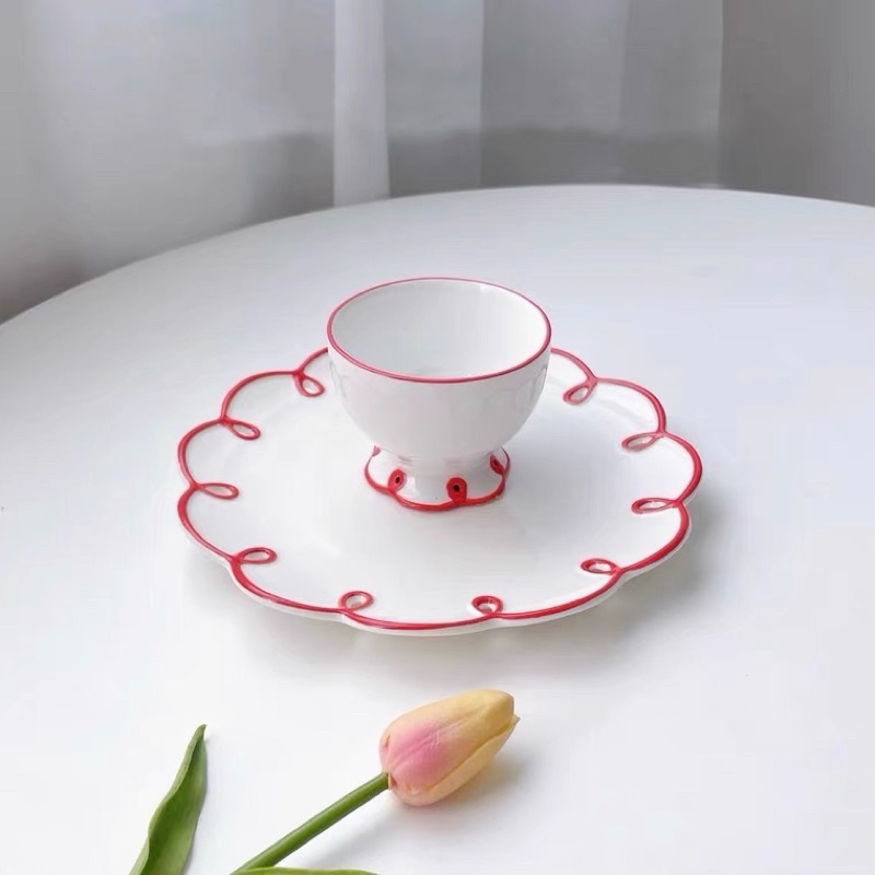 小紅邊浮雕杯盤 杯碟 花邊杯盤 手工杯盤