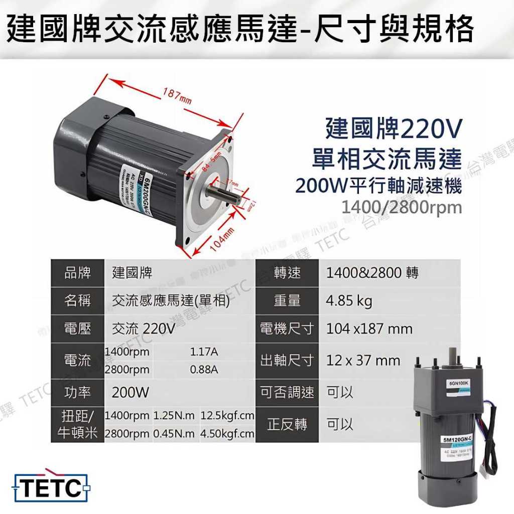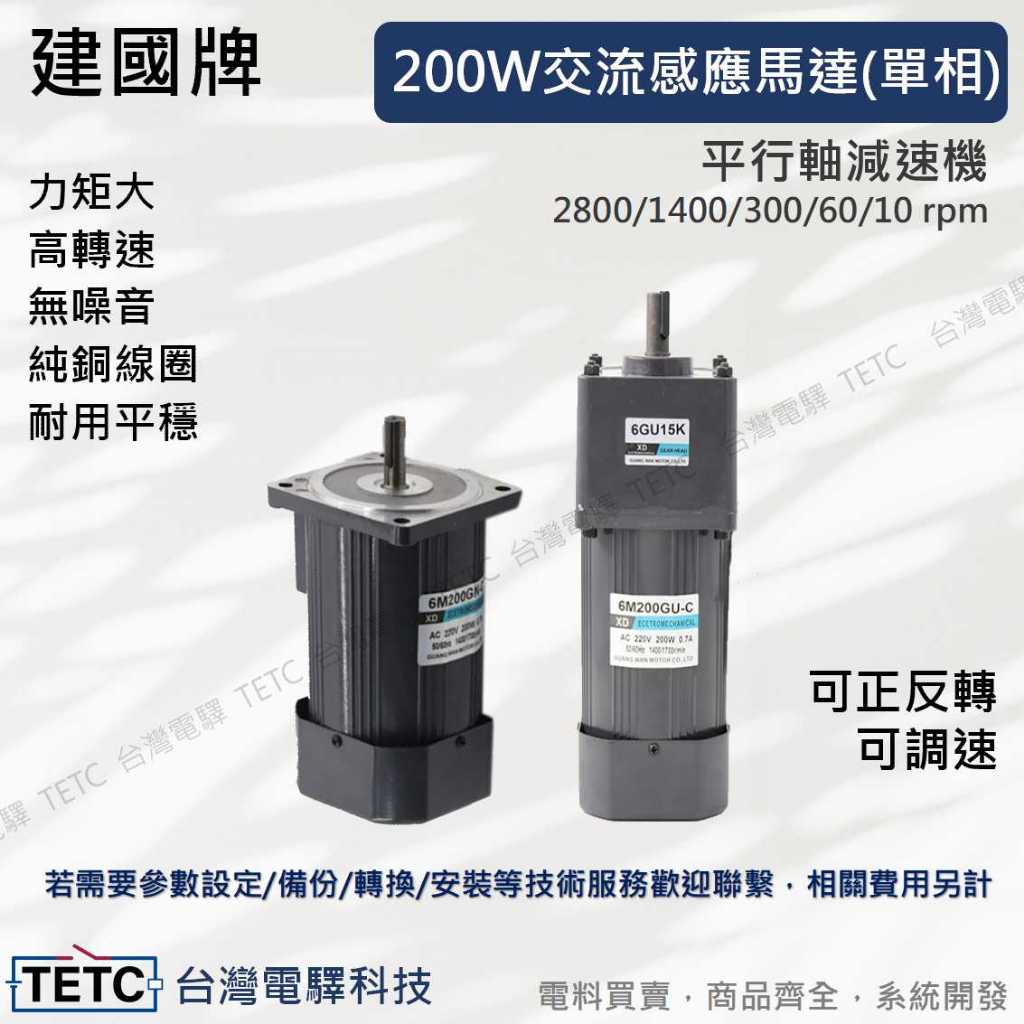建國牌220V單相交流馬達200W,平行軸減速機,含控制器可調轉速正反轉,2800/1400/420/210/70rpm