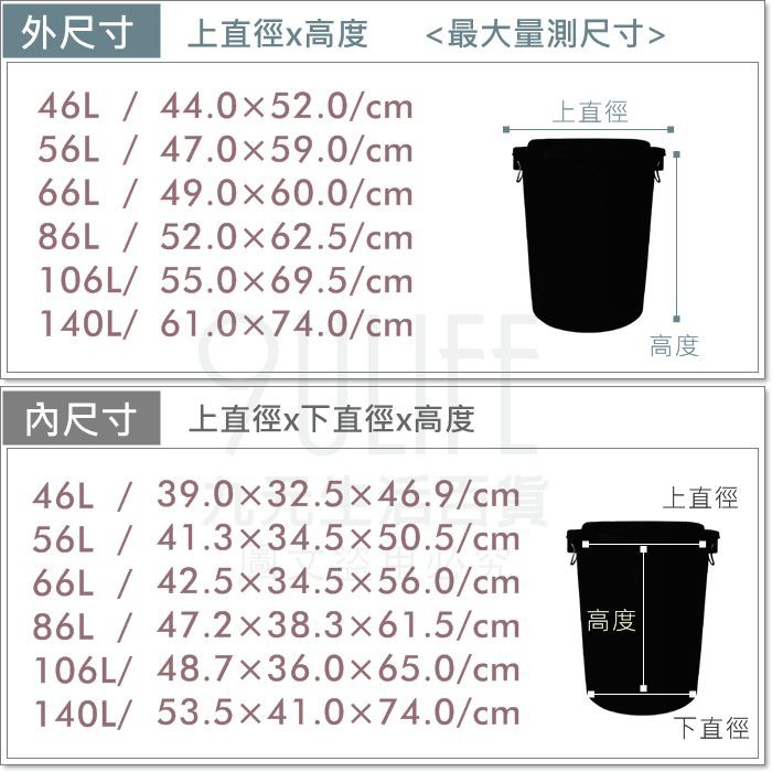 收美 加厚萬年桶 46L 56L 66L 86L 106L 140L 萬能桶 回收桶 廚餘桶 大垃圾桶 台灣製【九元】