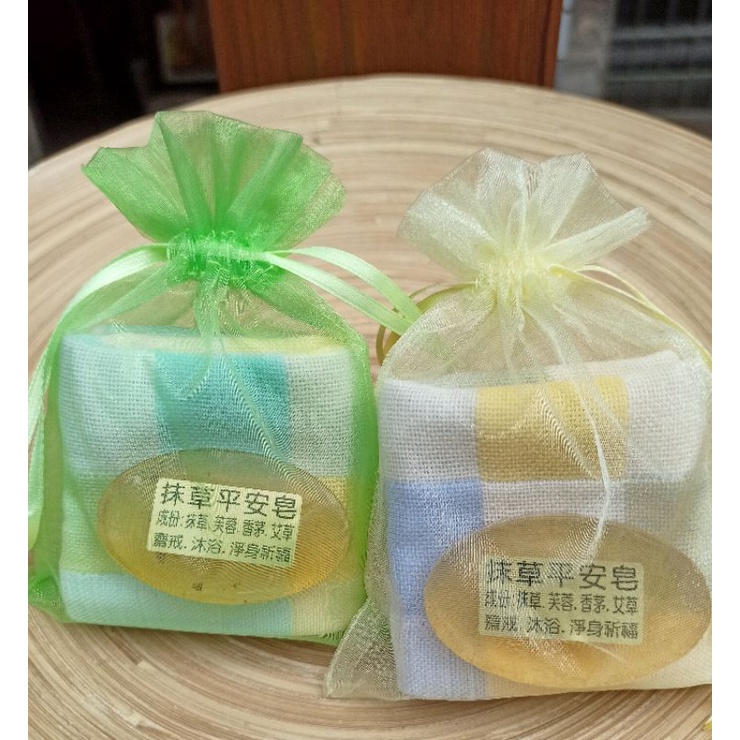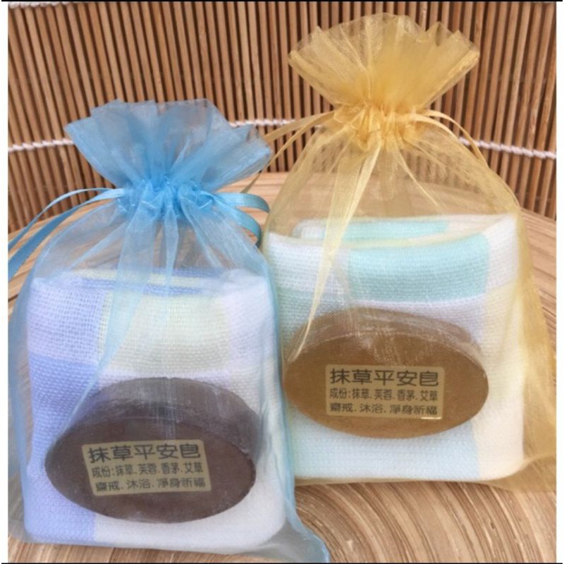 方格棉麻紗手帕+抹草平安皂+素色雪紗網袋~告別式回禮禮儀用品廟會贈品答客禮喪事毛巾回客禮送客禮