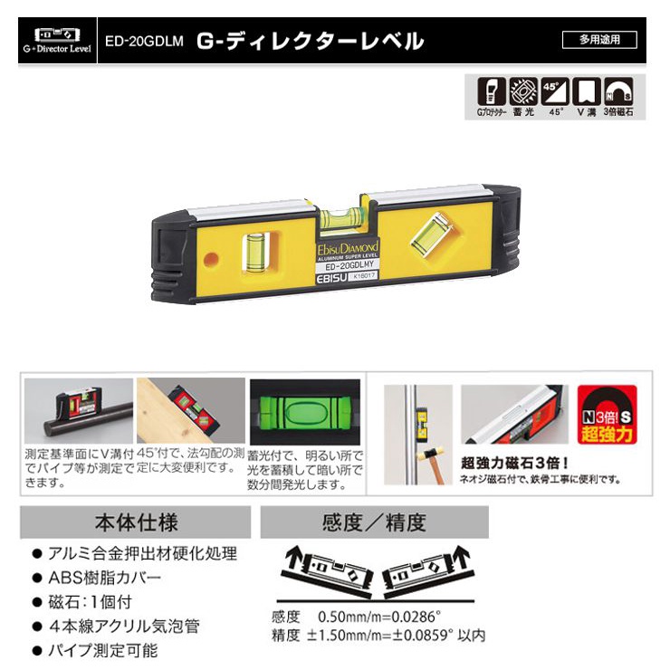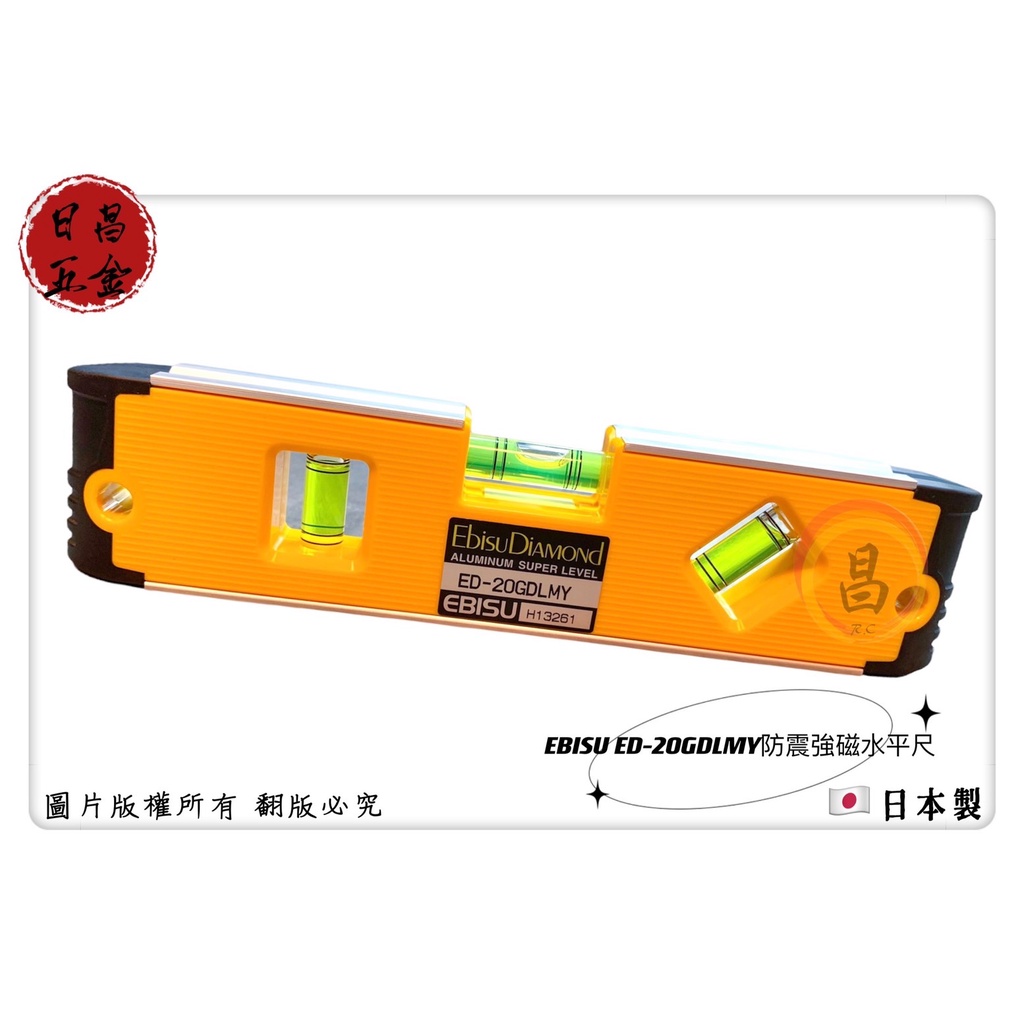 日昌五金 附發票 日本製 EBISU ED-20GDLMY 8吋 防震強磁水平尺 附磁 200mm 夜光 輕巧