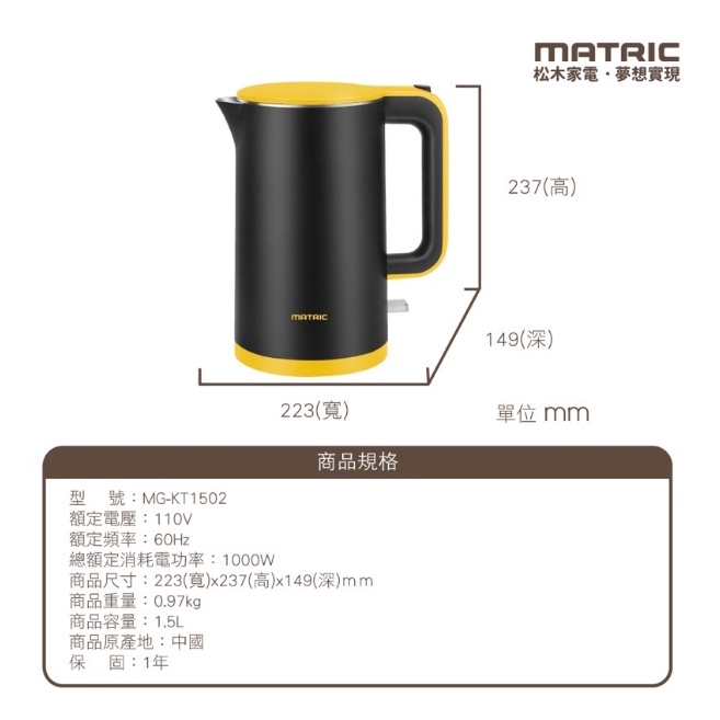日本松木家電 1.5不鏽鋼雙層防燙快煮壺MG-KT1502 (英國STRIX溫控器)