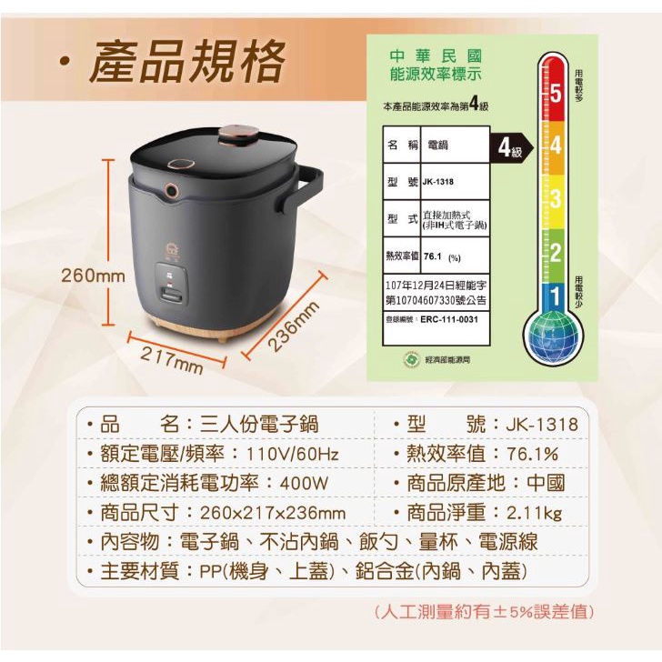 晶工_三人份電子鍋/ JK-1318 /典雅造型 單鍵烹飪 可拆式蒸汽蓋與內蓋 1.5mm合金厚釜內鍋