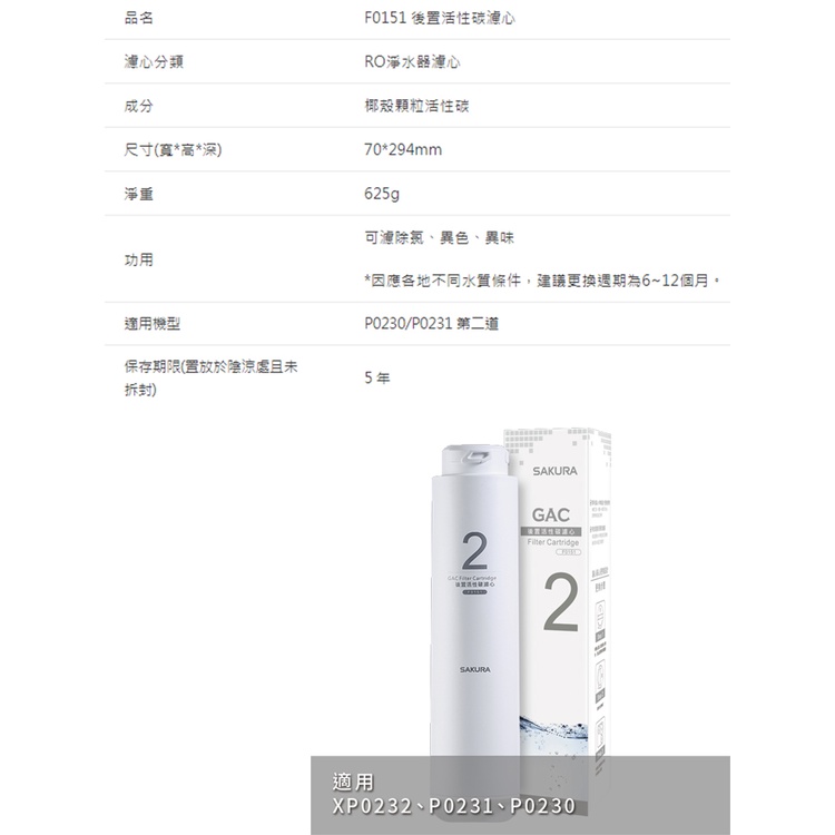 櫻花牌-F0151-後置活性碳濾心 適用機型P0230/P0231第二道-無安裝僅配送