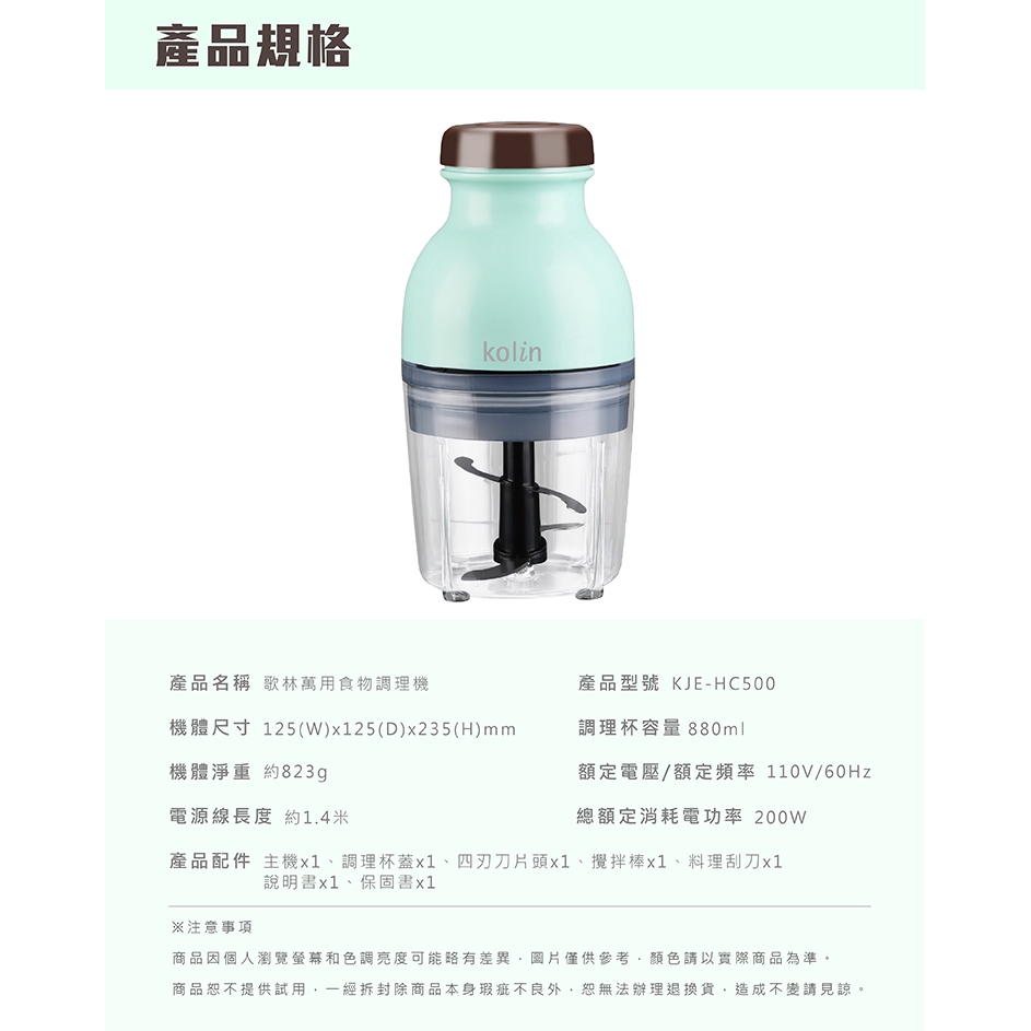 歌林KJE-HC500萬用食物調理機/研磨/打蛋機/攪拌機/絞肉/蒜泥/果汁/醬料/副食品