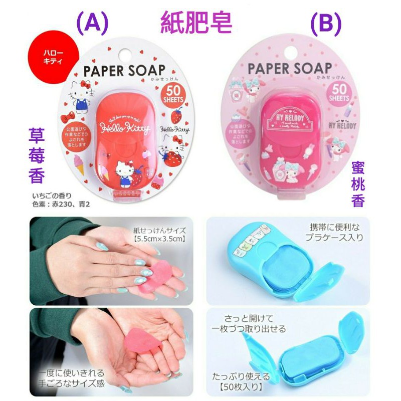 毛毛屋 Hello Kitty 草莓香 美樂蒂 蜜桃香 紙肥皂 外出清潔 攜帶方便 50枚 AB款擇一 1個入 請註明