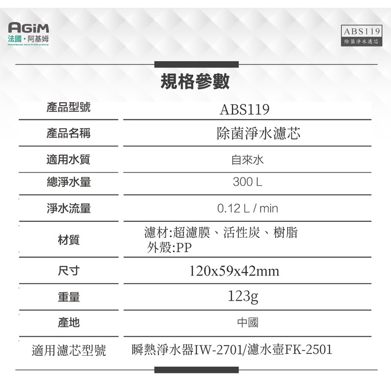 法國 阿基姆AGiM 除菌淨水專用濾芯 ABS119(IW-2701/FK-2501專用) 支援蝦皮物流免運