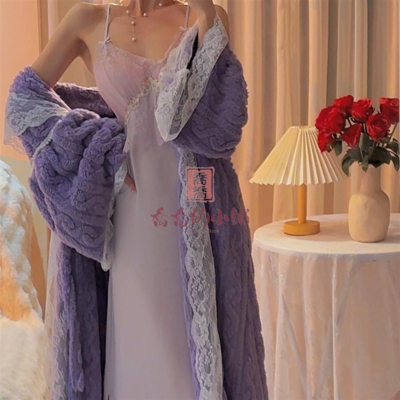 浴袍 睡袍 浴巾衣 珊瑚絨浴袍【絕絕紫】冬季新款睡衣加厚睡袍女士吊帶加絨奢華優雅睡裙家居服