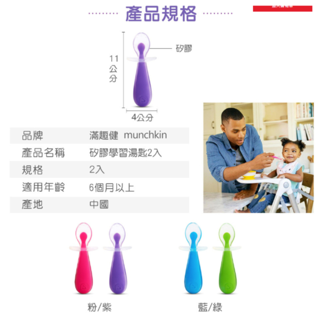 滿趣健 munchkin 矽膠學習湯匙2入 矽膠湯匙 學習餐具 適合6個月以上【公司貨】小豆苗