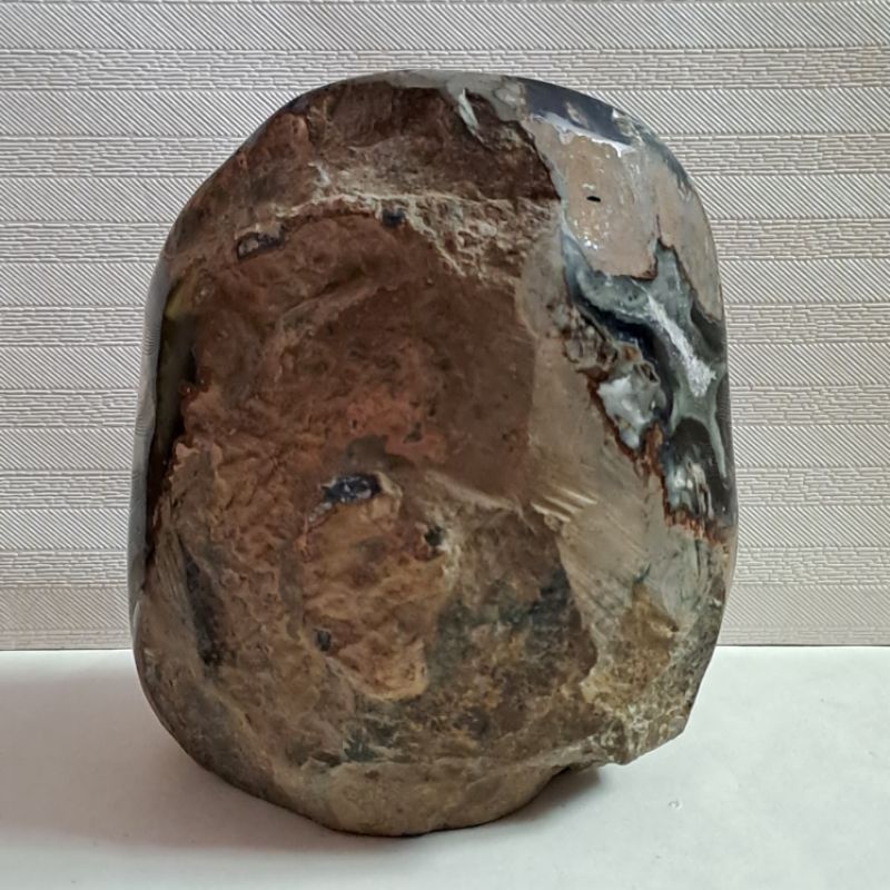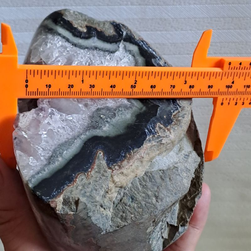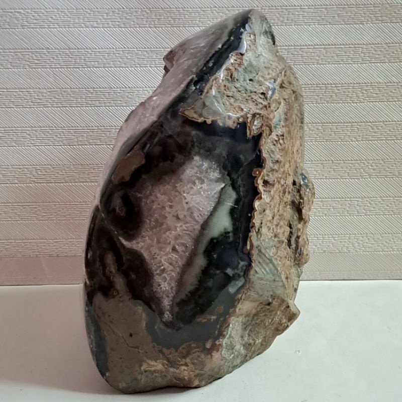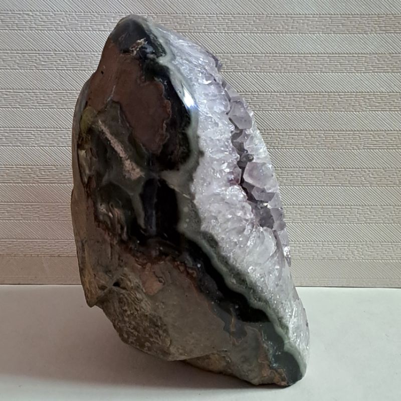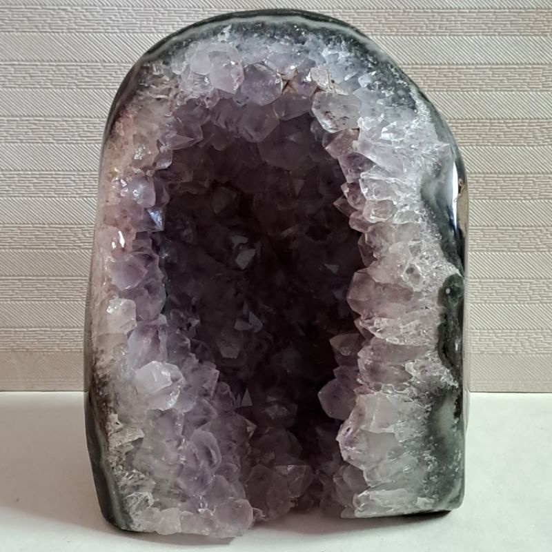 烏拉圭紫水晶、紫晶鎭,高15公分,內凹洞深,晶體帶彩虹光,左右側皆有晶體層可透光