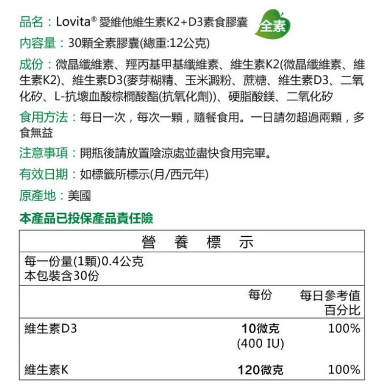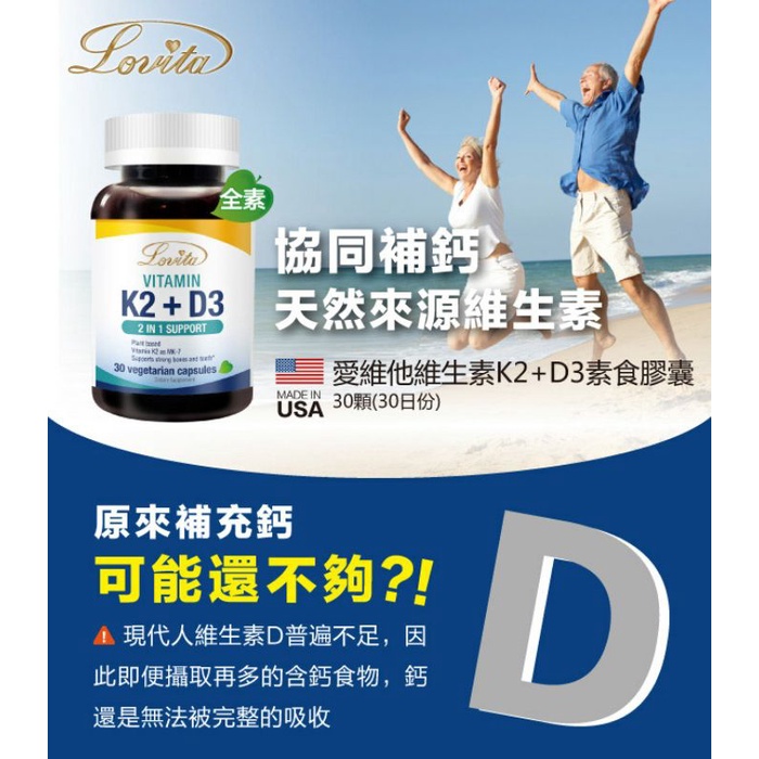 現貨 多件優惠+蝦幣回饋 Lovita愛維他 維他命K2+D3素食膠囊 30顆 新效期