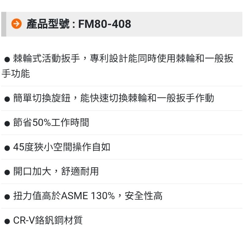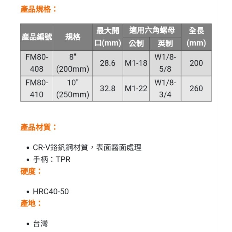 百利世 8吋/10吋 棘輪式活動扳手 開口扳手 FM80-408/410 材質:鉻釩鋼CR-V 產地:台灣-【便利網】