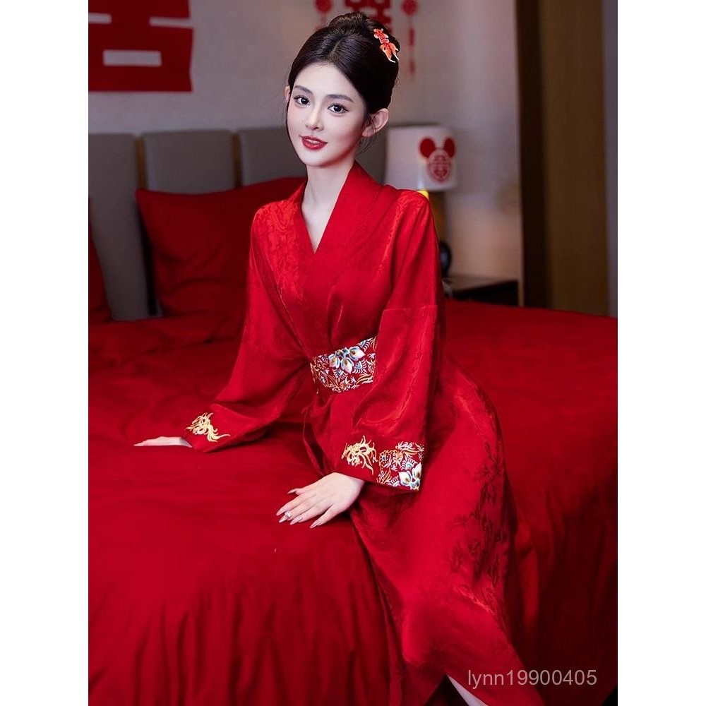 睡衣 浴袍 新中式舒適 透氣 親膚 中長款 春秋大碼 家居服新中式晨袍女結婚新娘高級感睡衣本命年紅色冰絲婚禮長款睡袍浴袍