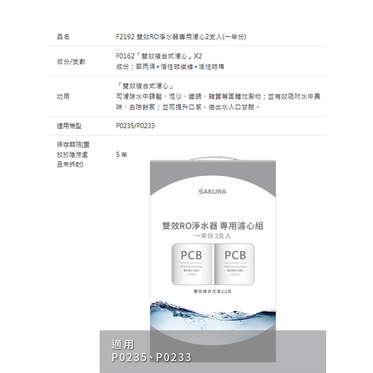 私訊享優惠-櫻花牌-F2192-雙效RO淨水器專用濾心2支入(一年份) 適用機型P0233/P0235-無安裝僅配送