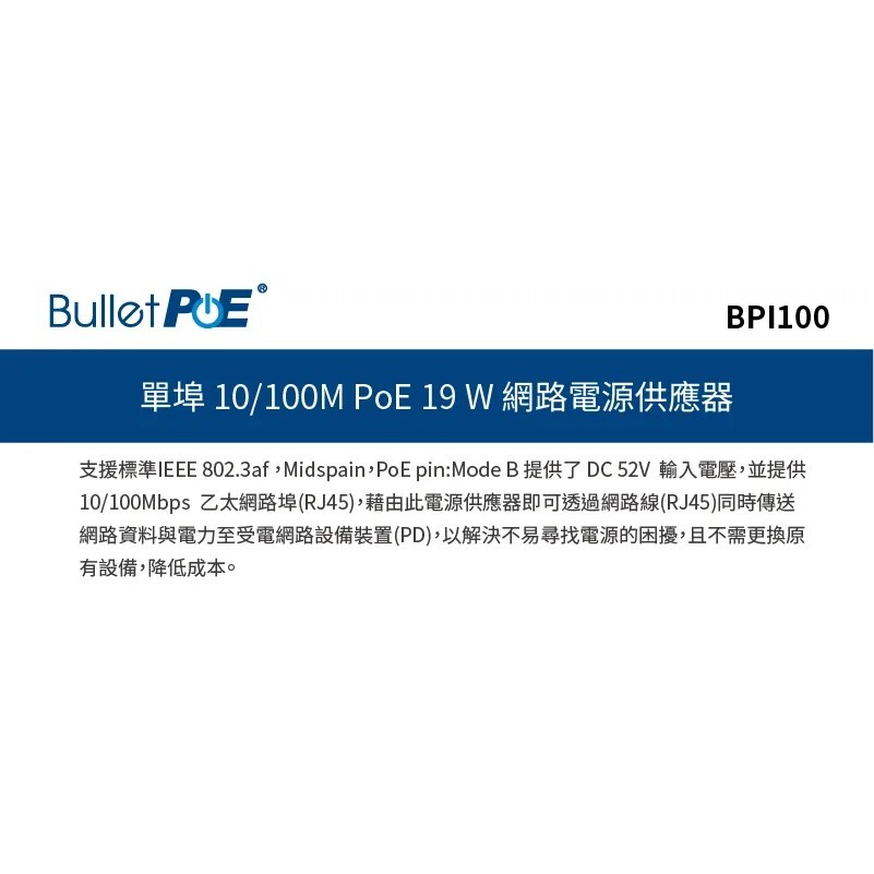 網路電源供應器 (BPI100) BulletPoE 單埠 10/100M PoE Injector 19W