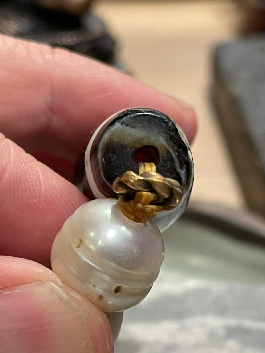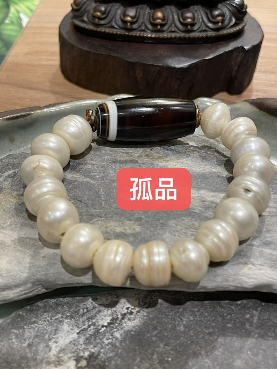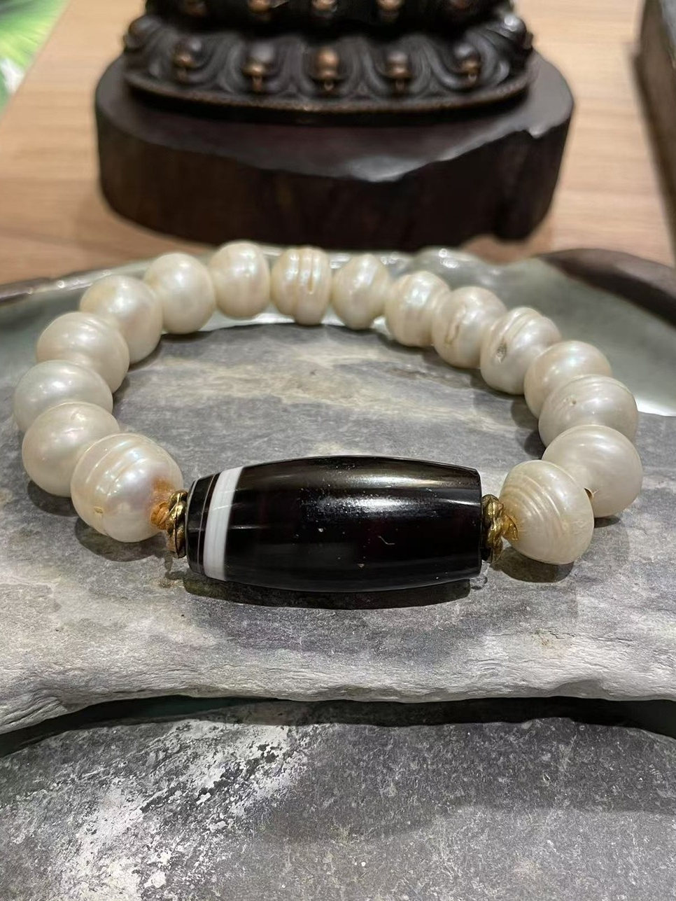 線珠(孤品)老天珠搭配天然珍珠 老天珠 黑白珠 天然珍珠 古珠 古董珠 老珠 老念珠 老佛珠 西藏老天珠