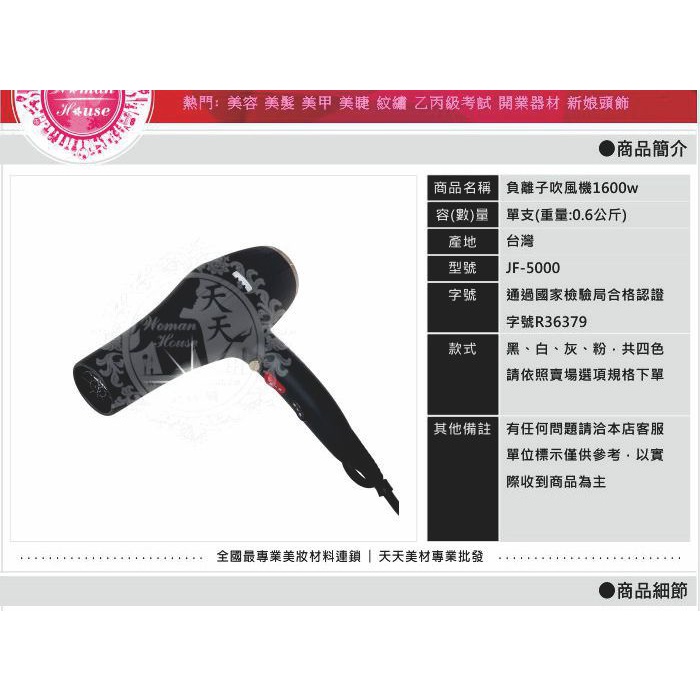 美如夢JF-5000負離子吹風機1600W-單支[59425]職業用吹風機 專業級吹風機 大風量 冷熱風