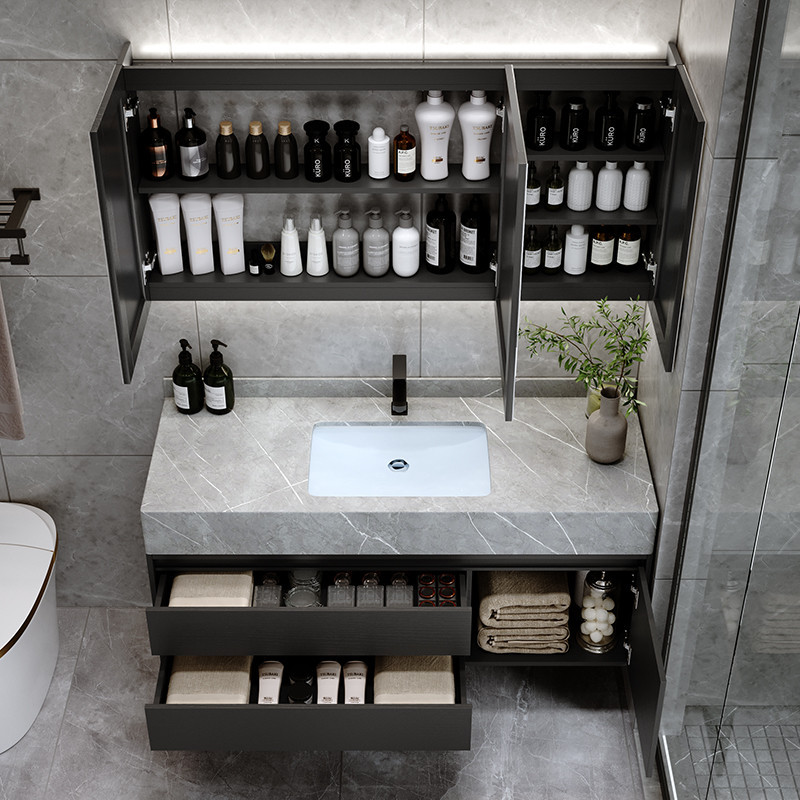 轻奢浴室柜组合岩板热弯一体洗脸盆陶瓷无缝盆定制卫生间洗漱台盆 浴室櫃 洗臉盆 洗手盆 小戶型 洗漱台 浴室台
