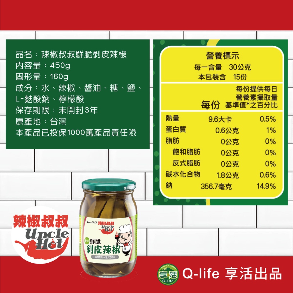 Q-Life 享活 辣椒叔叔 剝皮辣椒 450g 全聯 素食 爽脆 花蓮風味 雞湯 拌炒 小菜 微辣 超取限6瓶