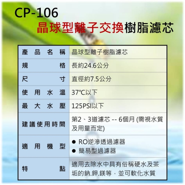 長江牌 CP-106 晶球型離子交換樹脂濾芯 (第二、三道) 除水垢濾心 軟化水質