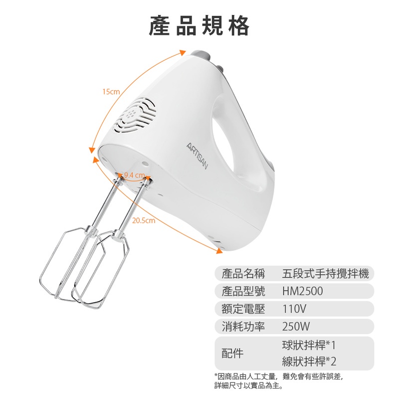附球形拌桿~附發票~ARTISAN 五段速 手持式攪拌機 HM2500