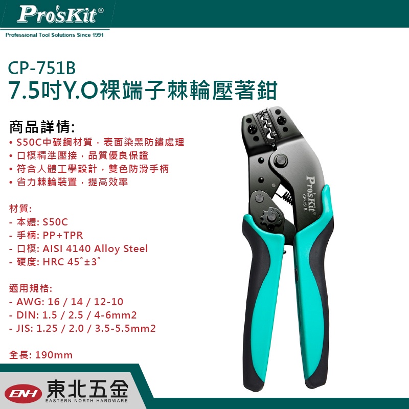 附發票 Pro'sKit 寶工 7.5吋 Y.O裸端子棘輪壓著鉗 (CP-751B) Y端子 丸型端子 R端子 台灣製造