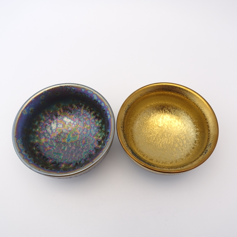 陳怡魁老師畢生設計監製:天目曜變雙缽組(天目溶群+天目溶金)。 高溫曜彩結晶、能量磁化缽、茶道器。贈中等缽兩個