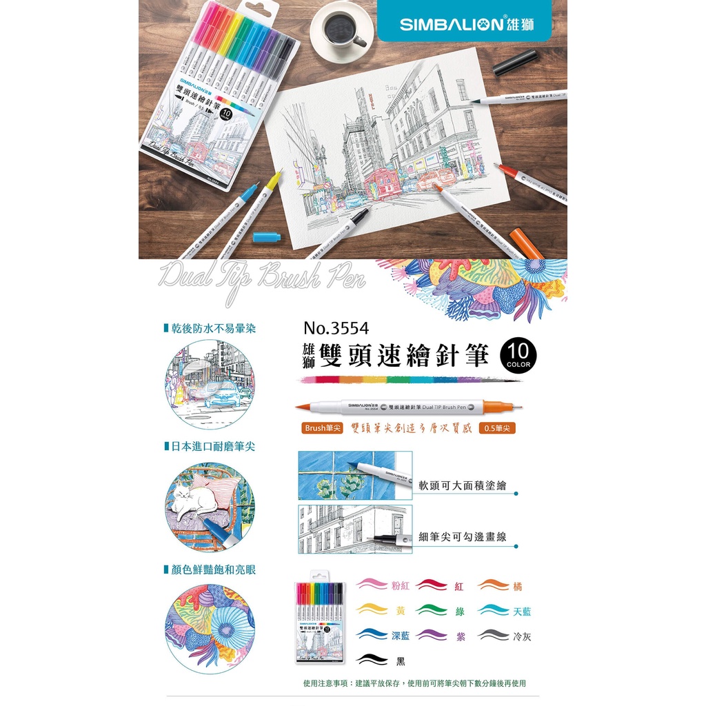 雄獅 NO.3554 雙頭速繪針筆 (10色組) (軟筆尖 + 0.5mm筆尖)