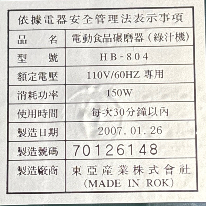 韓國原裝進口健康保貝電動食品碾磨器(綠汁機)HB-804/萬能調理機/慢磨料理機/慢磨機/飲料機/絞肉機/蔬菜果汁機