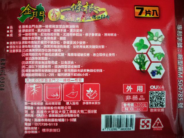 歐業 飛龍掌血一條根 7片裝 80克乳霜 精油貼布 免運 金門一條根 涼感新效期 金牌一條根 十大功勞葉 山芙蓉