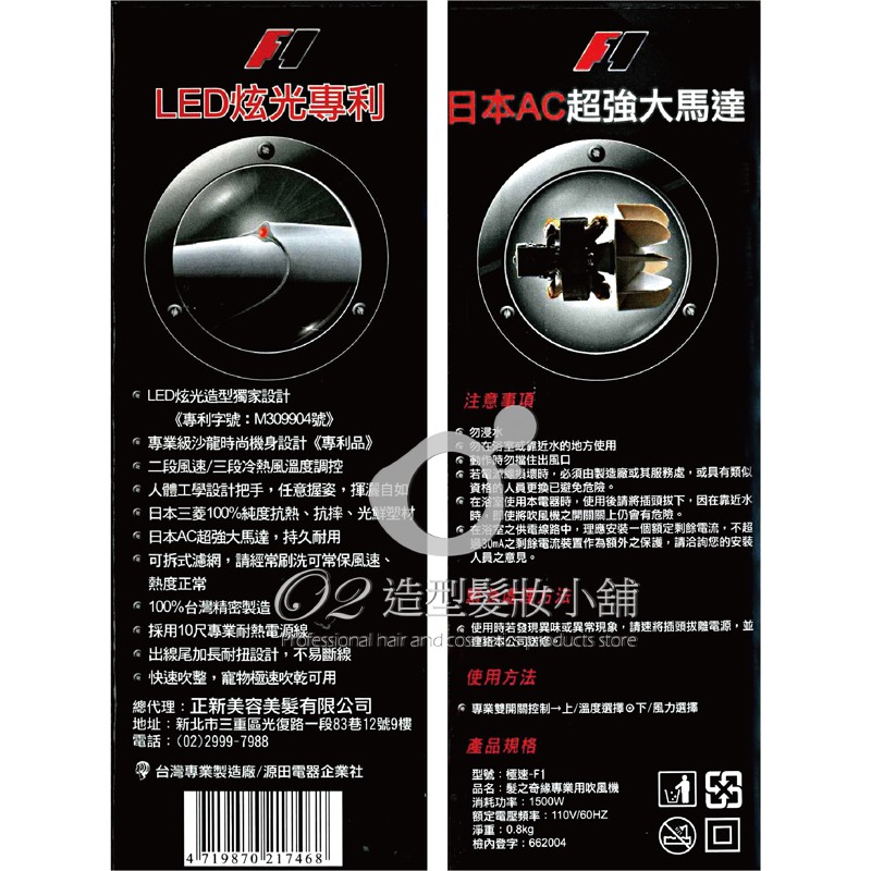 髮之奇緣 F1專業極速超強力吹風機 1500W 重吹 台灣製造 冷熱風皆有 備有集風器 日本馬達 LED炫光設計