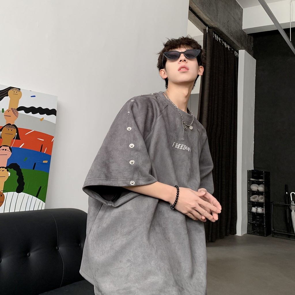 麂皮絨男夏季新款重磅痞帥潮牌設計感小衆寬鬆休閒五分半袖體恤