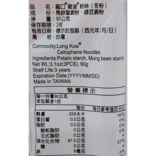 龍口 龍皇粉絲(冬粉)90g/袋