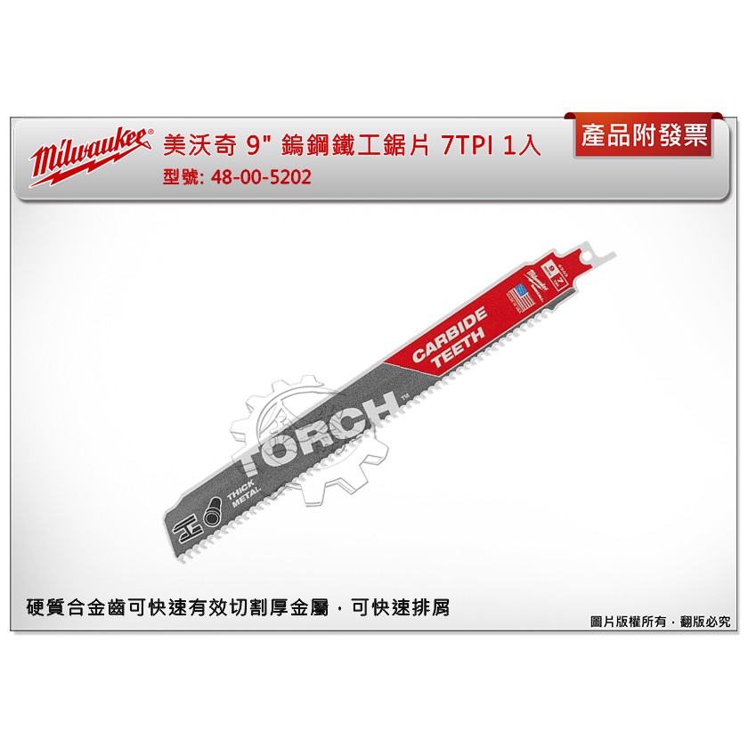 *中崙五金【附發票】Milwaukee 美沃奇 9" 鎢鋼鐵工鋸片 7TPI 1入 金屬切削 48-00-5202