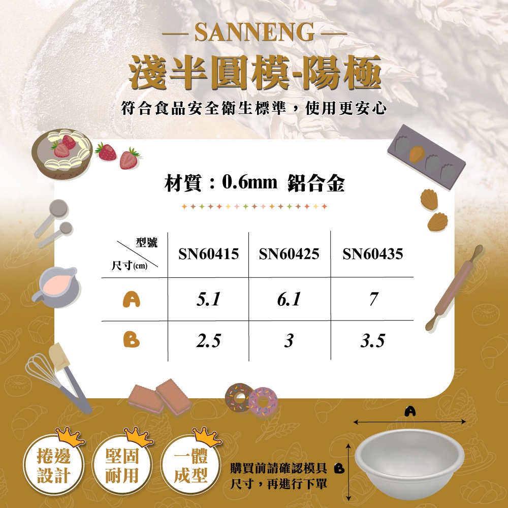 👑PQ Shop👑三能SANNENG 淺半圓模-5入(陽極) 鋁合金 圓徑61x30mm SN60425 SN60415