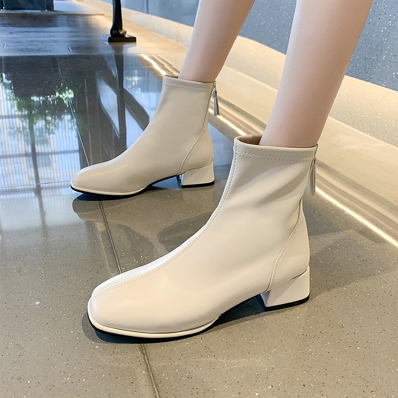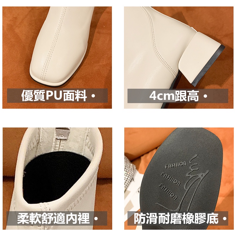 💗現貨💗34-43大尺碼優雅踝靴女 韓版氣質經典款素色短靴 方頭粗跟皮靴 黑/米/卡其 百搭切爾西靴 女士靴子 拉鍊短靴