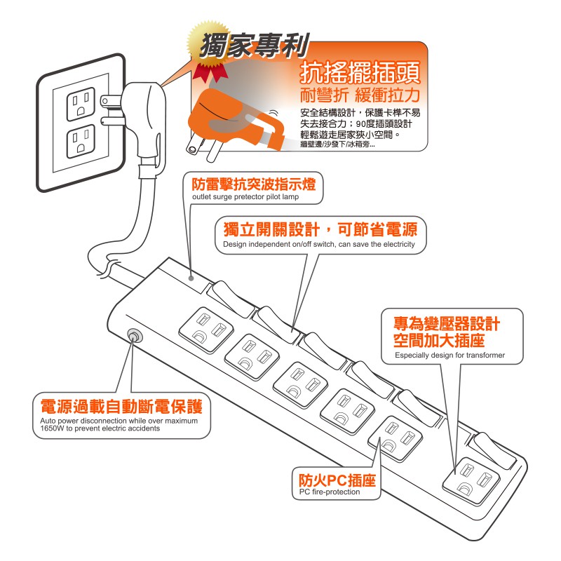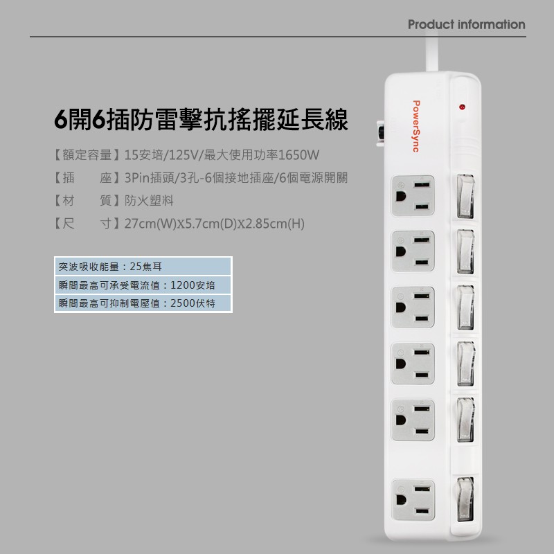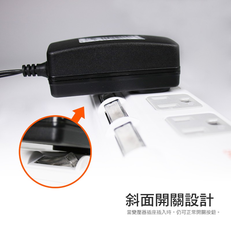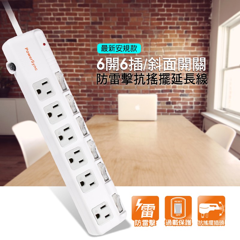 💛專利設計新安規💛群加 6開6插斜面開關防雷擊抗搖擺延長線 1.8M TPS366BN9018