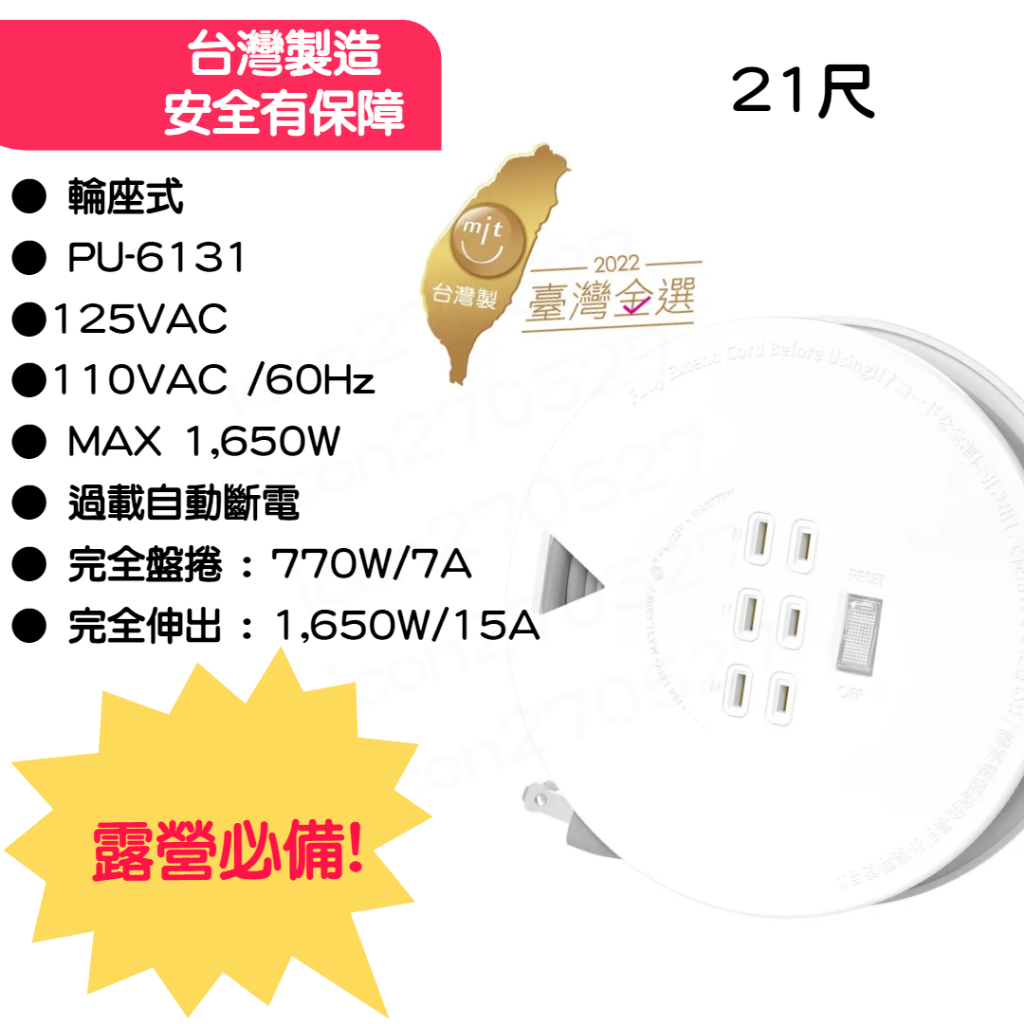 🔥免運🔥★台灣製造 iPlus+ 保護傘 PU-6131 迷你型輪座式延長線 21尺 🔥 露營 🔥
