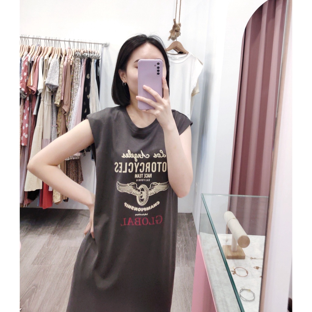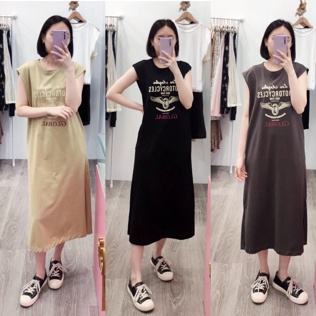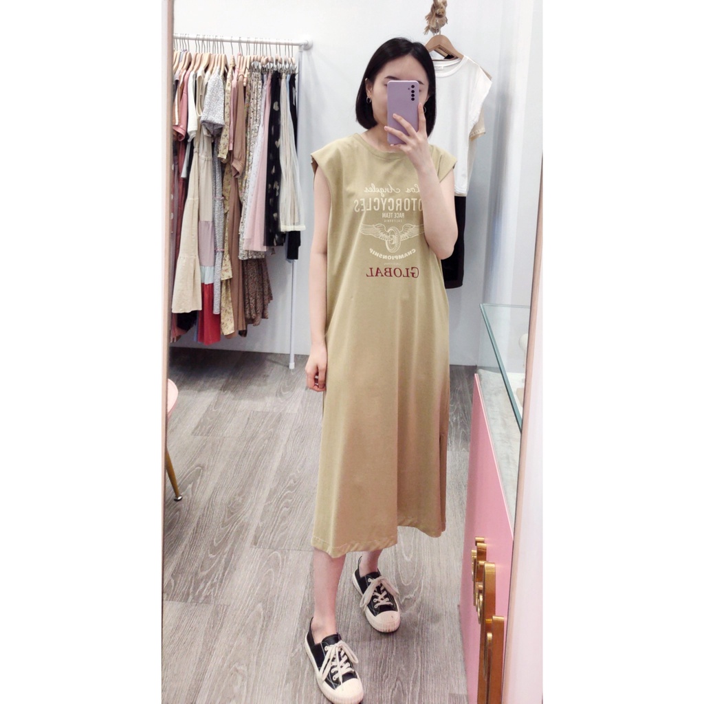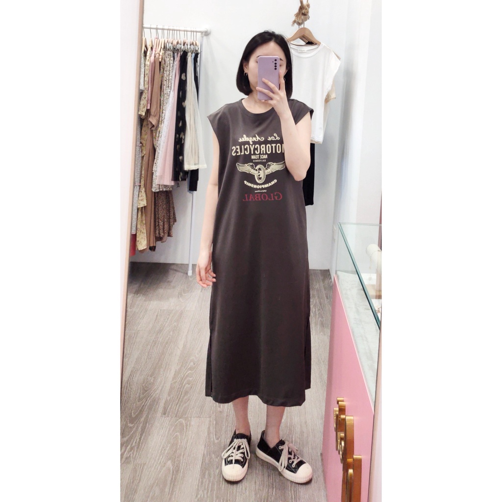 (C53)美式圖案側開衩休閒洋裝-3色 連身裙 背心洋裝 背心裙 長裙洋裝 短袖洋裝